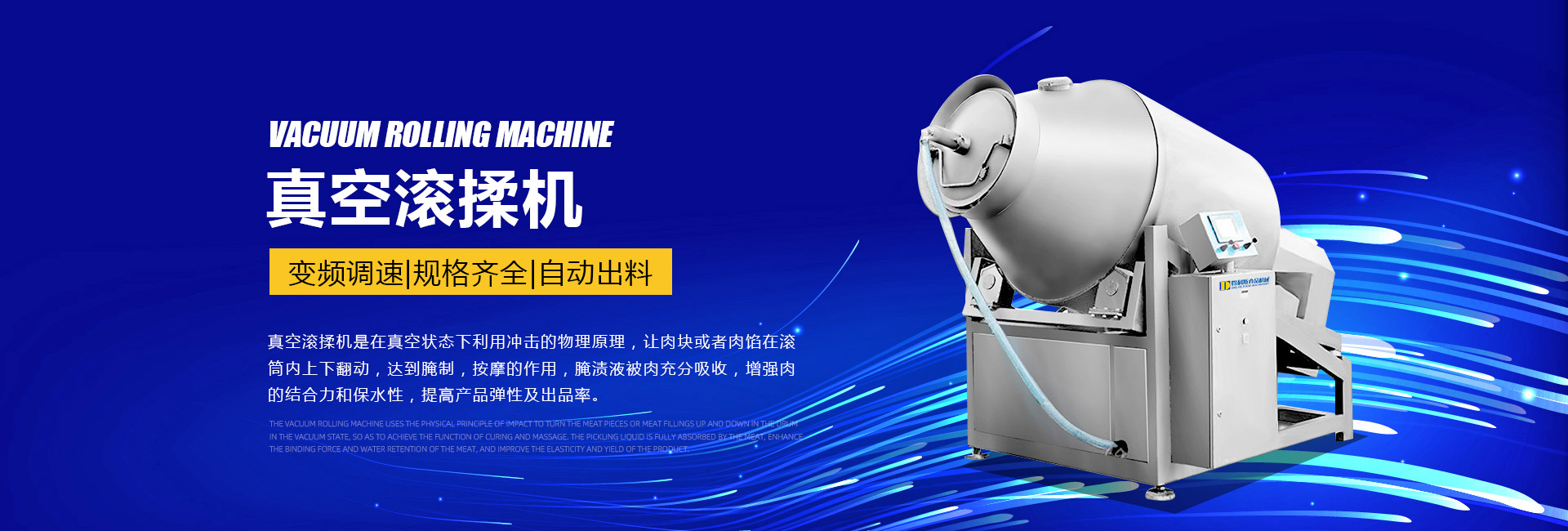 公司主要生產(chǎn)不銹鋼制品食品機(jī)械:各種規(guī)格型號(hào)真空滾揉機(jī)、制冷滾揉機(jī)、提升機(jī)、電加熱夾層鍋、肉丸機(jī)、真空攪拌機(jī)、絞肉機(jī)、灌腸機(jī)、打卡機(jī)、線扎機(jī)、斬拌機(jī)、鹽水注射機(jī)、煙熏爐、油炸機(jī)、巴氏殺菌線、連續(xù)油炸線、肉丸成型水煮線、醬鹵生產(chǎn)線、肉丸破碎機(jī)、真空包裝機(jī)、洗袋風(fēng)干機(jī)、豬頭劈半機(jī)、不銹鋼火腿模具、肉斗車(chē)、案桌、煙熏車(chē)、屠宰類(lèi)機(jī)械設(shè)備、清洗風(fēng)干設(shè)備、肉類(lèi)解凍設(shè)備、滾筒拌料機(jī)等。產(chǎn)品廣泛適用于火腿腸、肉丸、肉串、鹵制品、海產(chǎn)品、禽類(lèi)深加工、油炸、泡椒風(fēng)味、速凍水餃、魚(yú)豆腐、千葉豆腐、豆腐干、牛肉干、牛排雞排類(lèi)、禽蛋、麻辣、休閑、水果蔬菜清洗、中央廚房、餐飲連鎖、寵物食品等食品生產(chǎn)。